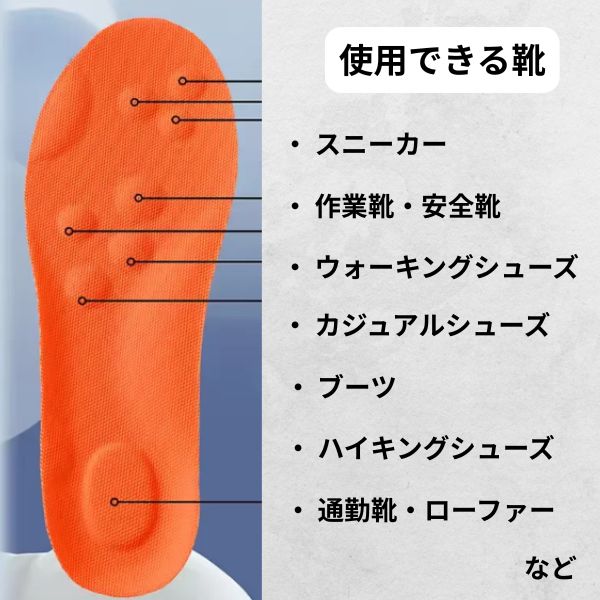 スニーカー、作業靴、ブーツなど幅広く対応。靴の中に入れるだけで、毎日の歩行が劇的に快適に。